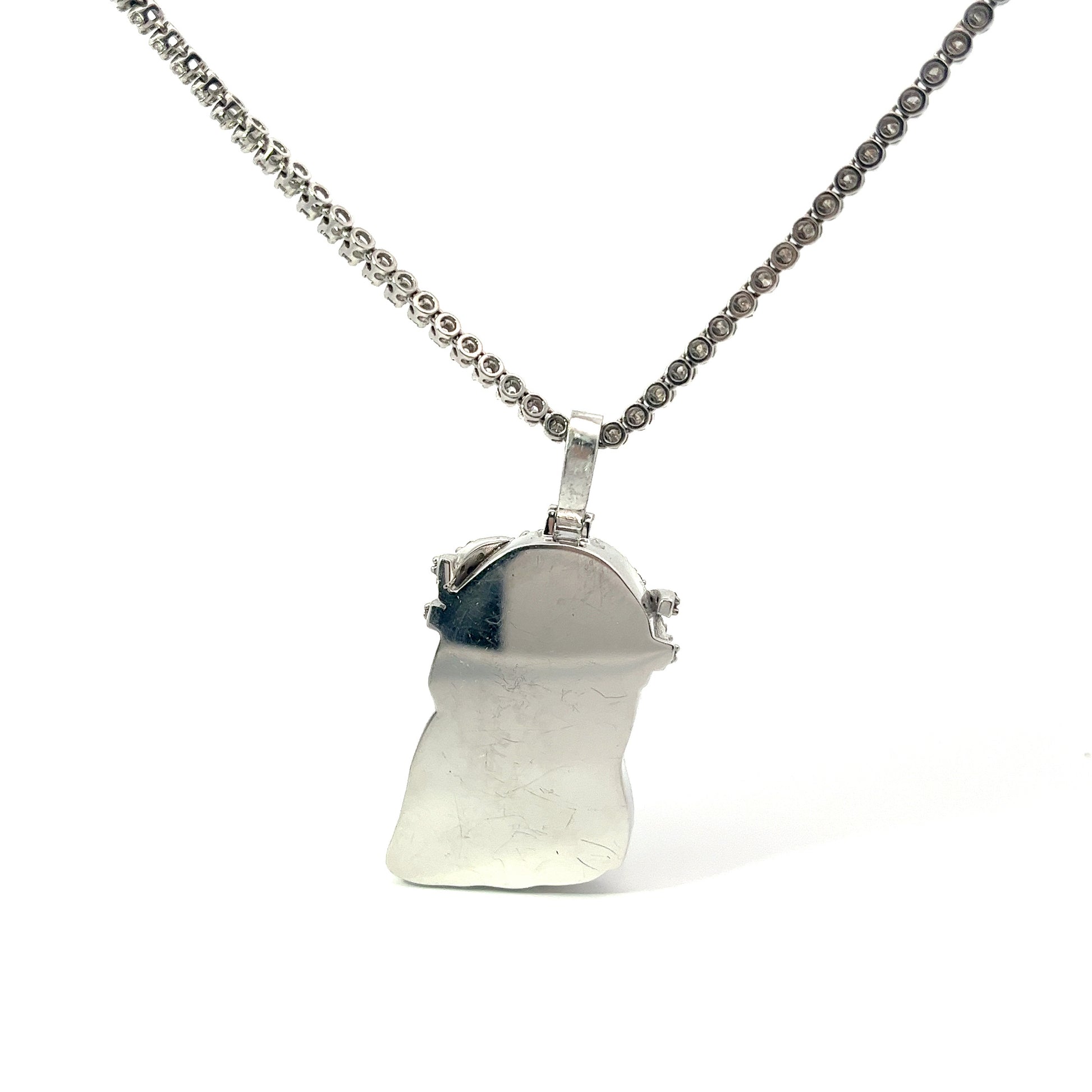 This 10k white gold Jesus pendant weighing 25.9 grams, with a total of 4.50 carats of diamonds, is a piece of jewelry that features a religious motif in a high-quality and stylish design. The pendant is crafted from 10k white gold, which is an alloy of gold and other metals, giving it a durable and lustrous finish. Overall, this pendant is a high-quality and substantial piece of jewelry that showcases religious devotion while also incorporating luxurious materials and design elements.